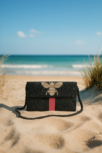 Stunning embroidered handembriodered bag that features embroidery 'sequins and beading. Beaded bee pattern with seedbeads makes it great fashion statement. Folder style with magnetic closure- luxurious satin lining inside 'beaded belt are the key features. Size 8 by 10 inches.