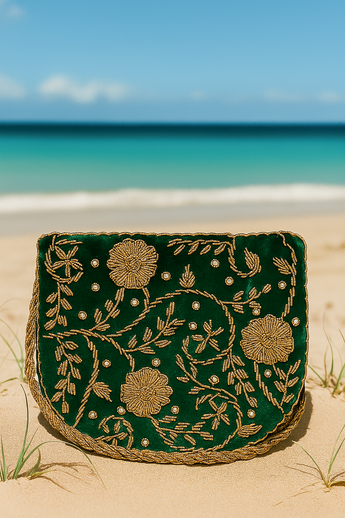hand embroidered Box bag button closure , spacious, splendid ,graceful and elegant. hand embroidery with needle,beads + Moti + pearls ,also sequences used , perfection made with hands by our local artisans.