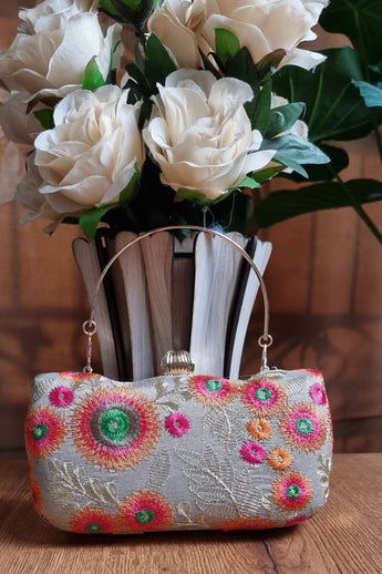 thread and tilla handembriory on net .comes with double removable chain .enough space inside covered with astar fabric.