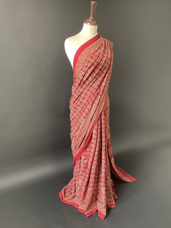 Draped in the warmth of maroon, this saree captures the earthy romance of Sindh’s sun-baked palette. The handmade block prints bring life to the fabric like desert flowers after rain—rare, radiant, and rooted in culture. Made on soft lawn, it’s equal parts comfort and craft, making it a striking pick for festive mornings or quiet, artistic gatherings. With every fold, it whispers legacy and confidence.