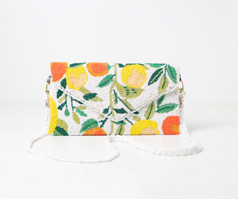 The make lemonade clutch is a burst of citrusy charm in styling and compact package. This handembriodered clutch is a zesty celebration, fully adorned with hand beaded lemons on both the front and back ,making it delightful accessory that's as refreshing as it's a chic. Carry this handcrafted clutch with Grace and Ease using the long beaded chain .the chain itself adds a touch of grace and novelty allowing you to sling it over your shoulder or across your body for a versatile look .all needle work with seedbeads ,pearls and stones . Vintage styled, innovative and refreshing look with a touch of tradition. Size 8 by 10 inches .