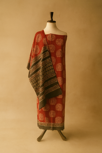 Description: Rooted in the rhythm of the desert and dyed in soulful surkh (crimson) tones, Surkh Baadal is a 2-piece suit handprinted by South Punjab’s women artisans using traditional wooden blocks.