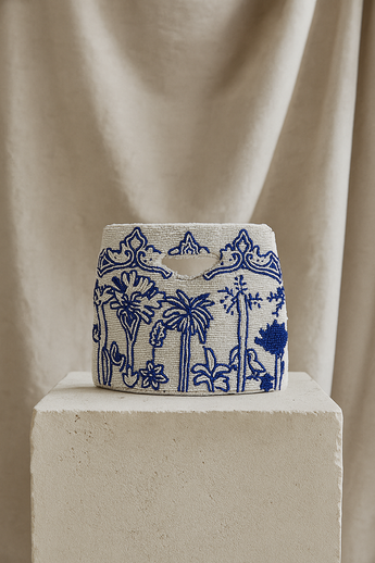 A petite piece with big character—floral embroidery in hues of royal blue for that extra splash of personality.